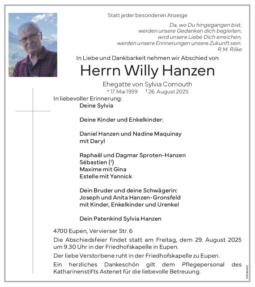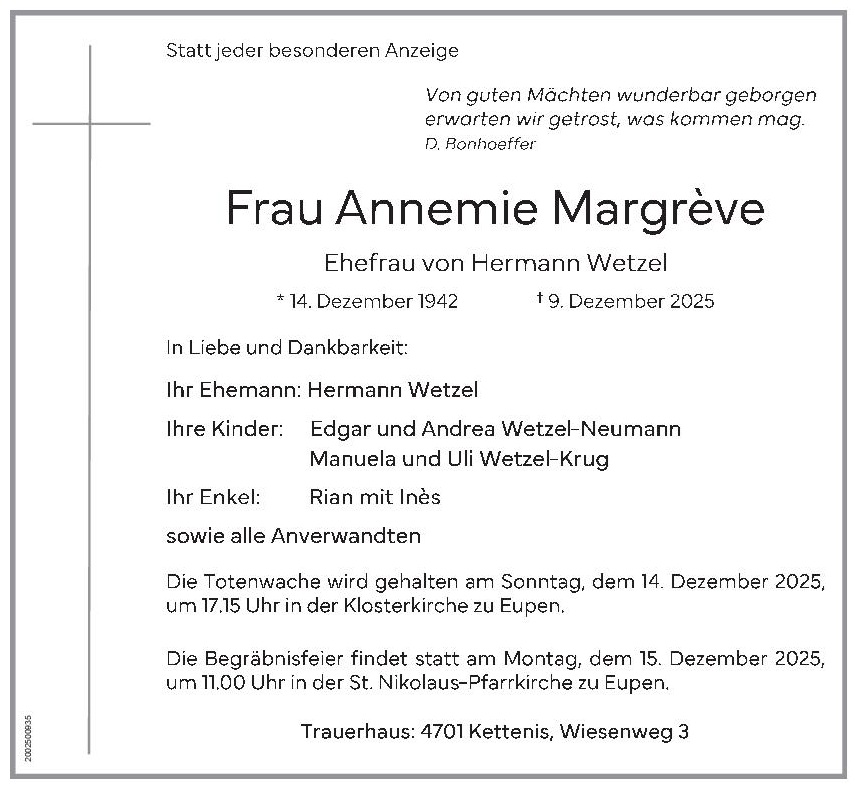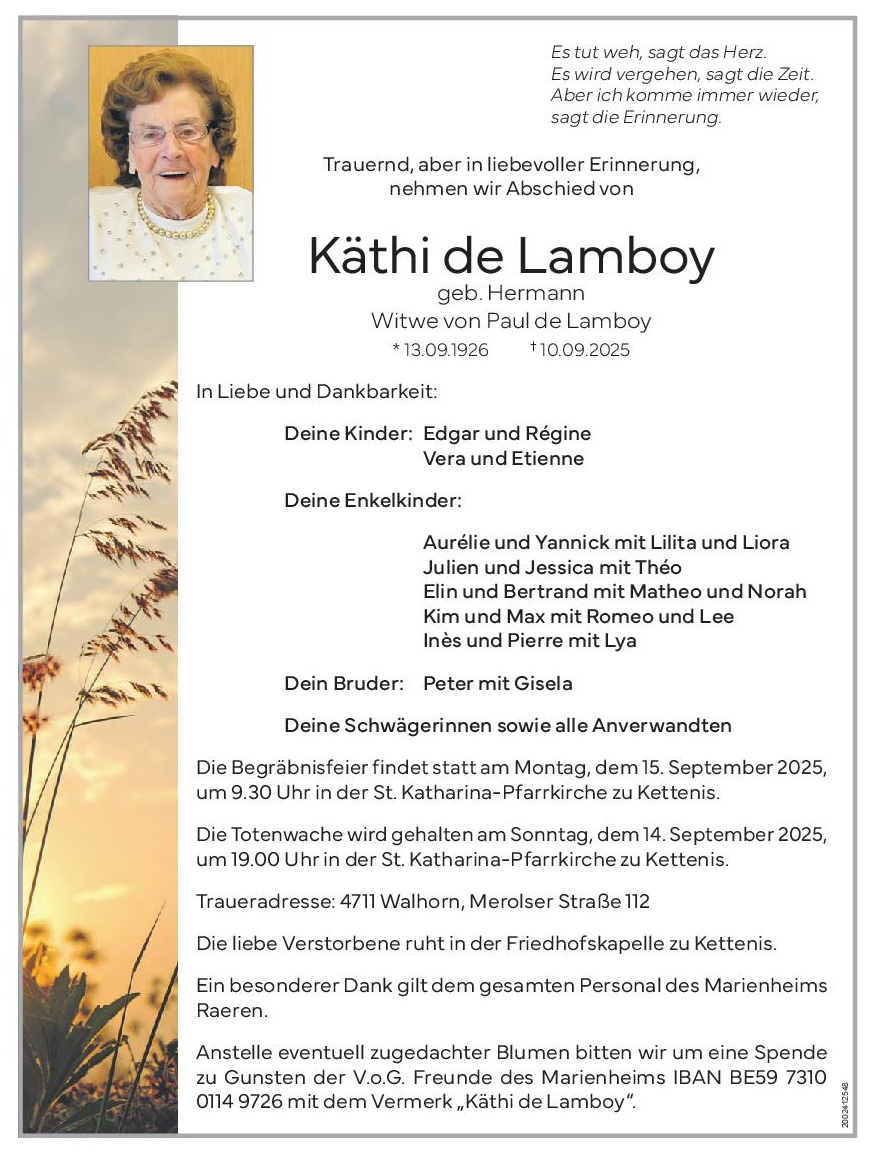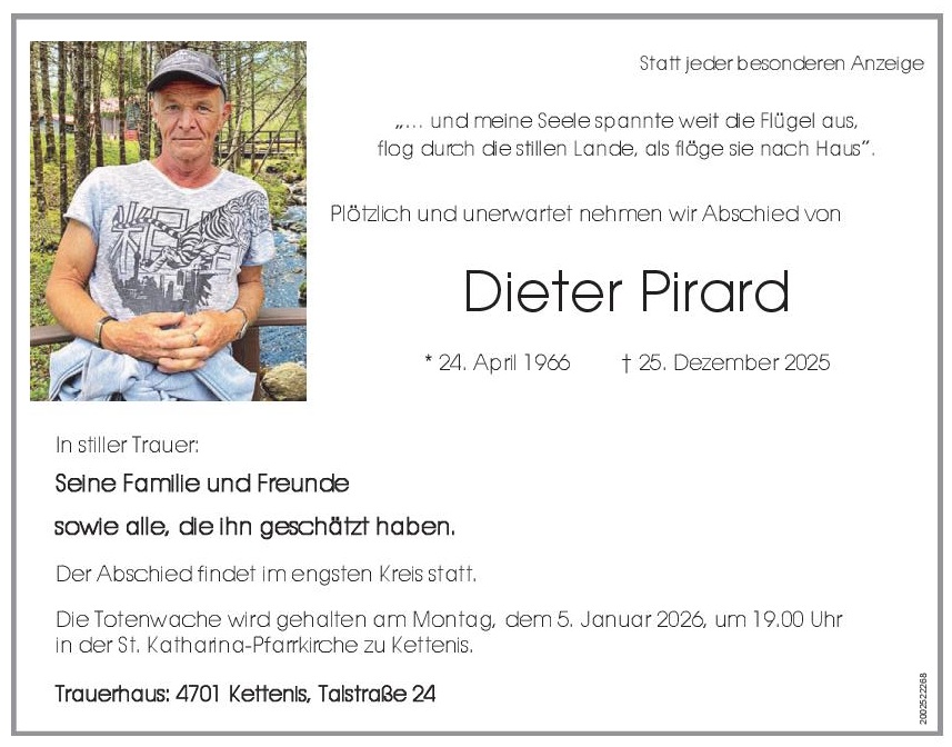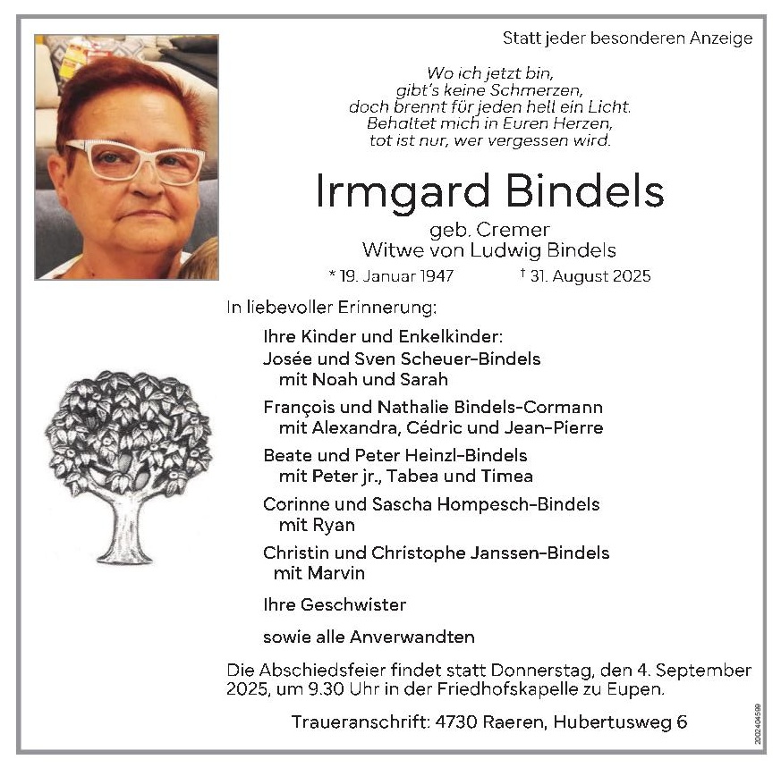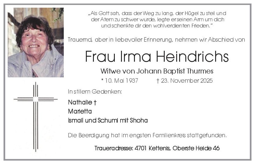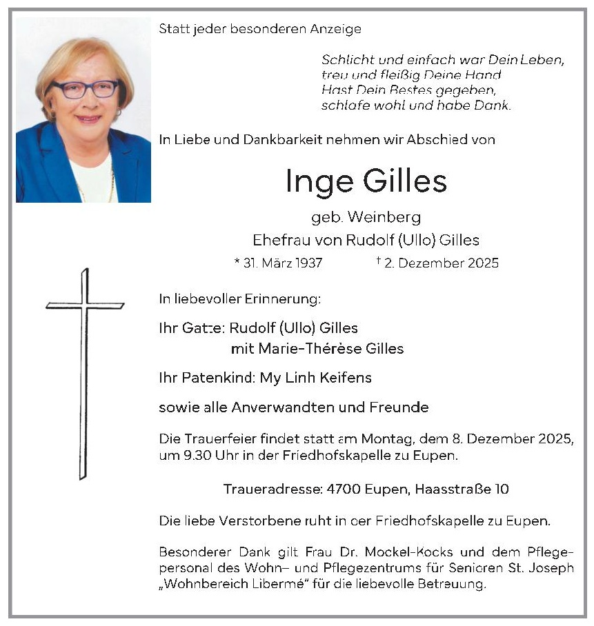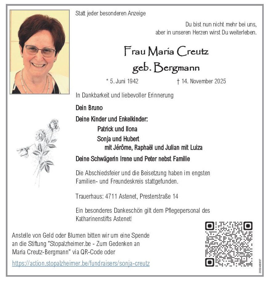 Hier finden Sie die aktuellen Traueranzeigen aus unseren Gemeinden. Klicken Sie zur Vergrößerung auf die Anzeige.